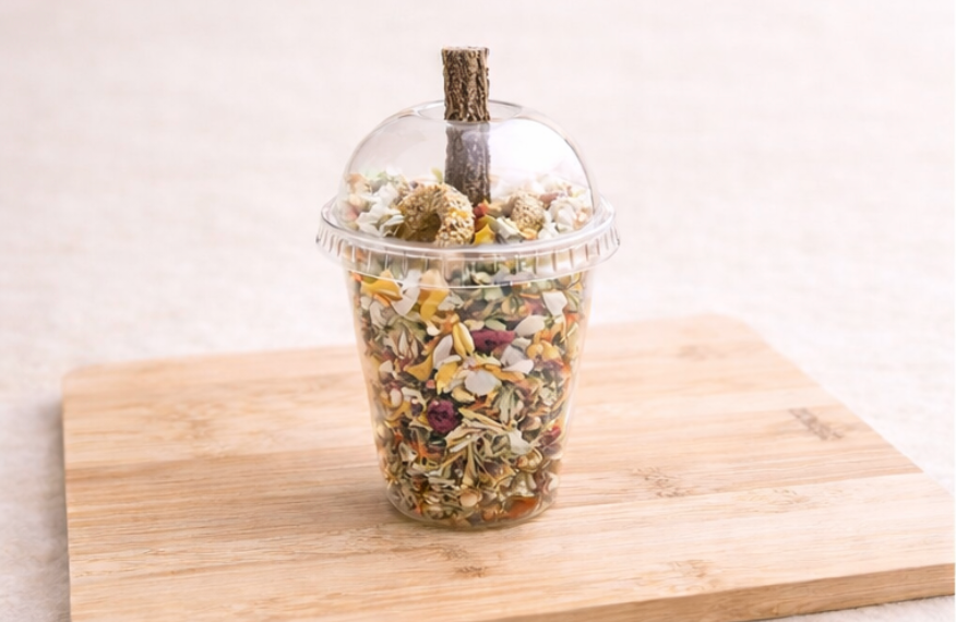 Treat your small pets to a fun and enriching snack with our Bunnacino! Each cup is filled with a delightful mix of hay-based treats or barley rings, natural forage, and crinkle paper to encourage natural foraging behaviour.